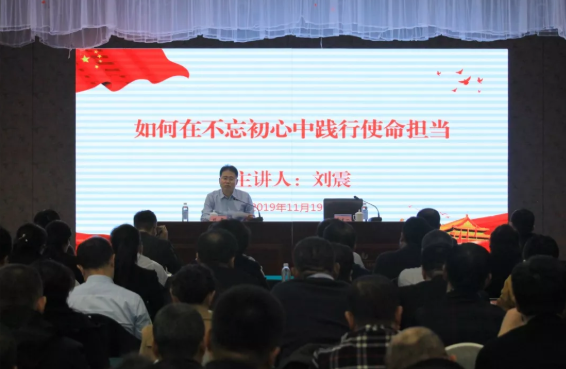 11月19日下午,集团党委书记、董事长刘震以“如何在不忘初心中践行使命担当”为主题,为集团全体党员干部讲授了一堂生动且内涵丰富的专题党课。刘震以习近平总书记在十九大报告中提出的“不忘初心,方得始终。中国共产党人的初心和使命,就是为中国人民谋幸福,为中华民族谋复兴。”为开篇,从“四心”、“三个坚持”为大家解读如何不忘初心,践行使命担当。刘震指出,不忘初心就是要有坚定理想信念、永葆本色的恒心,对党忠诚、政治坚定的忠心,全心全意为人民服务的赤子之心和实现中华民族伟大复兴的信心。我党在各个历史时期,涌现出孔繁森、焦裕禄等一批先进的党员干部楷模,甘于奉献,为民服务,作为党员领导干部,职工群众的所思所盼就是努力的方向。刘震强调,当前集团正处于筹备期、适应期,各项工作可谓机遇和挑战并存,优势与困难同在,此次主题教育恰逢其时,全体党员干部要践行使命担当,爱岗敬业,不要过多考虑个人得失,干在实处、走在前列,充分发挥好党员的带头模范作用。