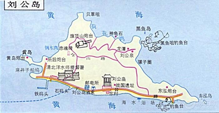 刘公岛位于威海湾口,距市区旅游码头2.1海里(1海里等于1.852公里),乘旅游船20分钟便可到达。它面临水云连天的黄河,背接湛蓝的威海湾,素有“不隅屏藩”和“不沉的战舰”之称。刘公岛北陡南缓,东西长4.08公里,南北最宽1.5公里,最窄0.06公里,海岸线长 14.95公里,面积3.15平方公里,最高处旗顶山海拔153.5米。岛东碧海万顷,烟波浩淼,岛西与市区隔海相望。全岛植被茂密,郁郁葱葱,以黑松为主,多达2700余亩,1985年,被命名为“国家森林公园”。1999年,刘公岛被建设部命名为“国家文明风景区”。